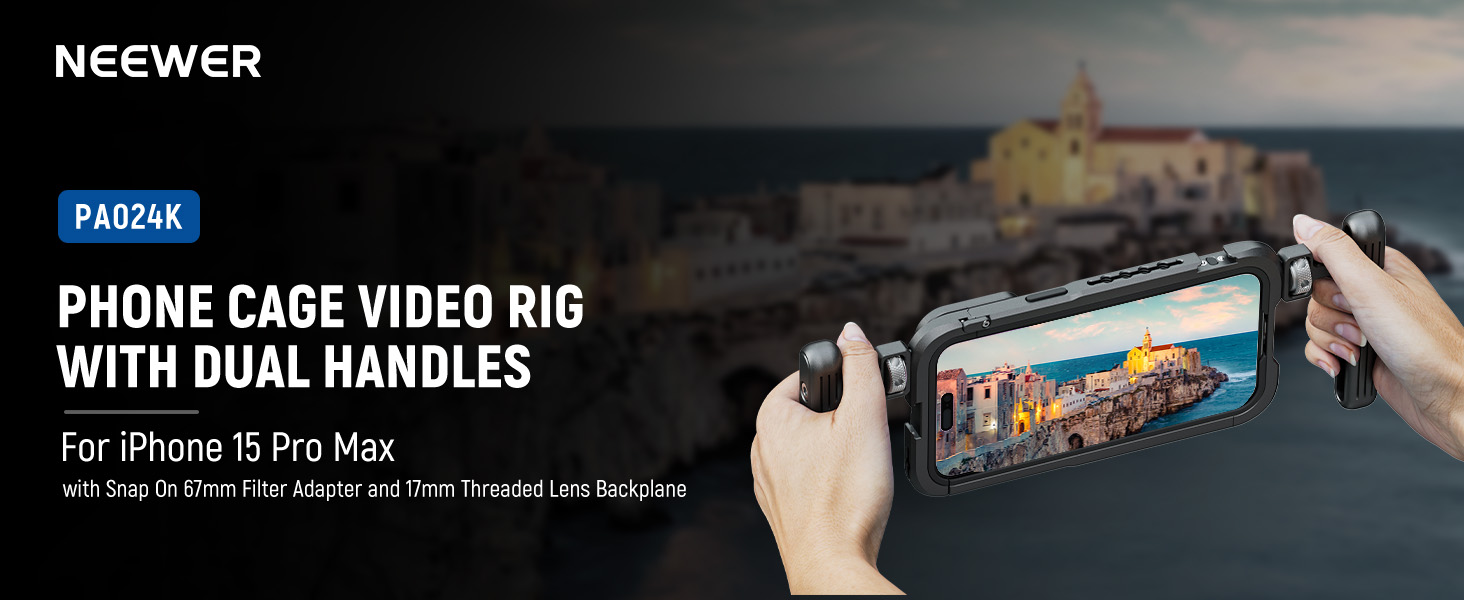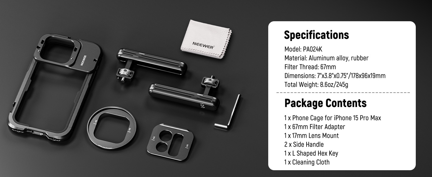 | Short Description | NEEWER PA024K 15 Pro Max Cage Video Rig with Dual Handles is only compatible with iPhone 15 Pro Max, this CNC machined aluminum alloy phone cage features dual side handles for stable handheld video shooting and a soft rubber cushion for reliable protection where you go. The hollow back is compatible with MagSafe wireless charger MagSafe battery pack and NEEWER PA010 Magnetic Phone Holder. |