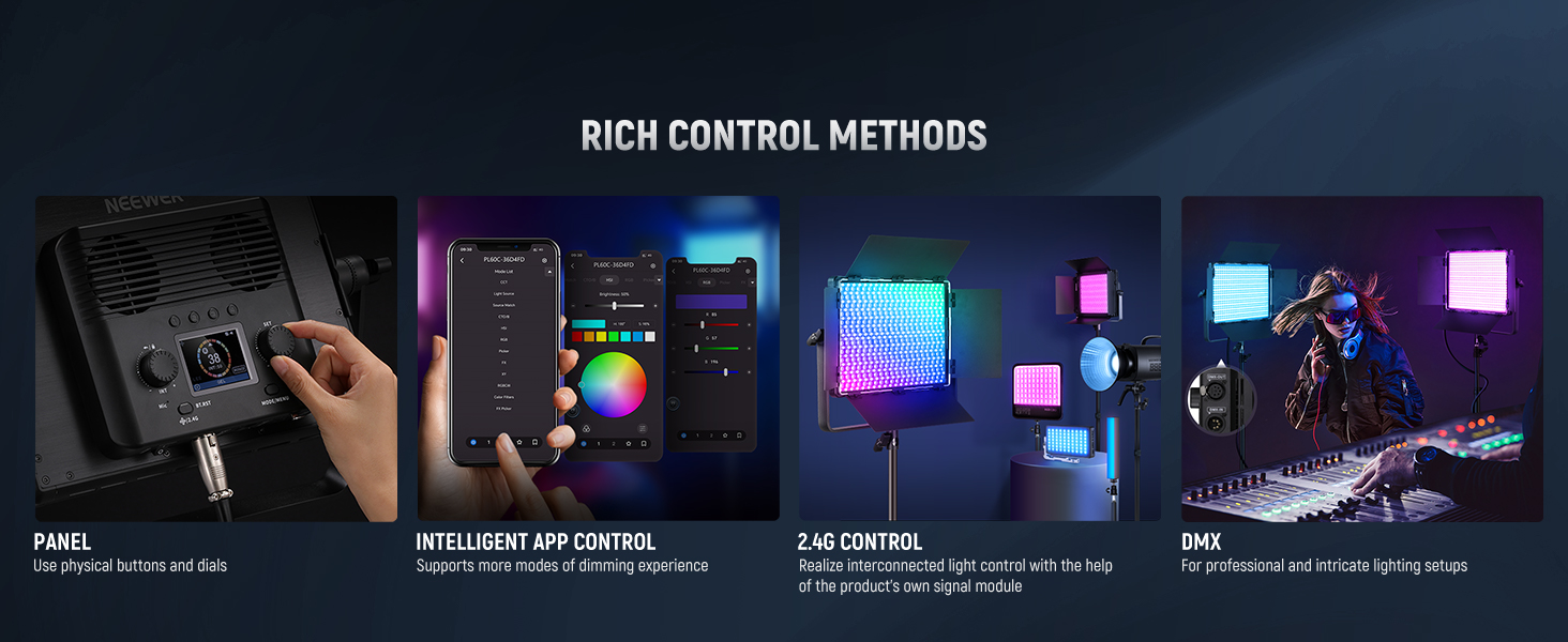 2.4G/APP/DMX/Panel Control Modes- For different scenarios, this light supports 4 lighting control modes. The inbuilt 2.4G module allows you to simultaneously control a group of lights (including SL90 RGB1 RGB C80 RGB 1200 MS60C MC60B MS150B FS150B BH30S CB60B). The NEEWER APP lets you unlock hidden functions with the smartphone. The color LCD panel on the light body displays all the information you need. A 5-pin DMX port can connect to a DMX console for complicated stage lighting setups.