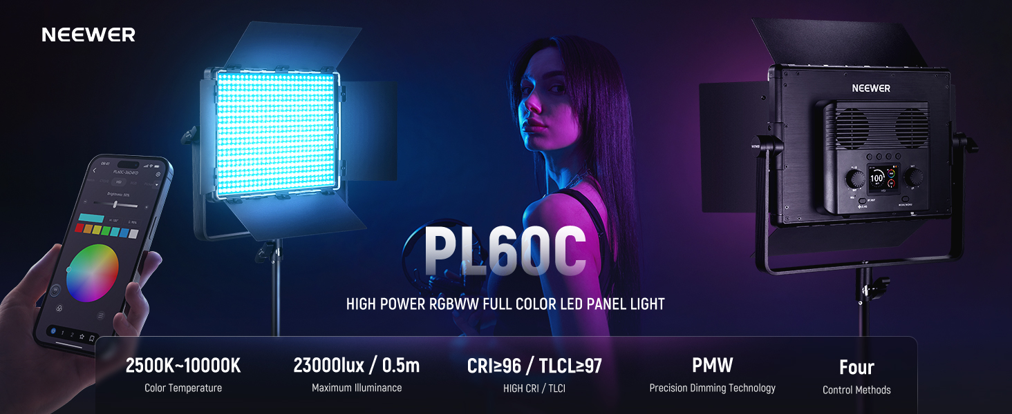 RGBCW Full Color LED Panel Light- With 800 premium LEDs, NEEWER PL60C Full Color RGB Video Light offers 60W maximum power and 6400lux/1m 23000Lux/0.5m illuminance for bright illumination. PWM technology ensures 1% precise increment in a 0-100% dimming range with 4 precise dimming curves. CRI 96+ and TLCI 97+ bring faithful color reproduction. 2500K-10000K color temperature and 0-360° hue angles give you creative photography lighting for video recording filming streaming podcasting photoshoots.