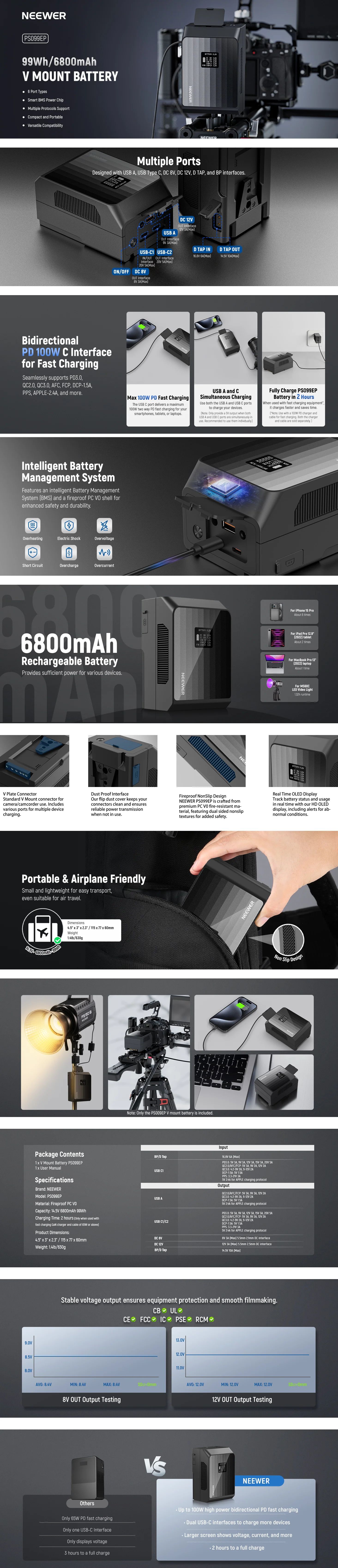 | Short Description | The NEEWER PS099EP Mini V lock battery seamlessly supports APPLE-2.4A, PD3.0, QC2.0, QC3.0, PPS, AFC, FCP, DCP-1.5A, and more fast charging protocols. The USB C in & output port delivers a maximum of 100W high power two way PD fast charging and can be fully charged in 2hrs using a PD fast charging 100W GaN charger set (not included) |