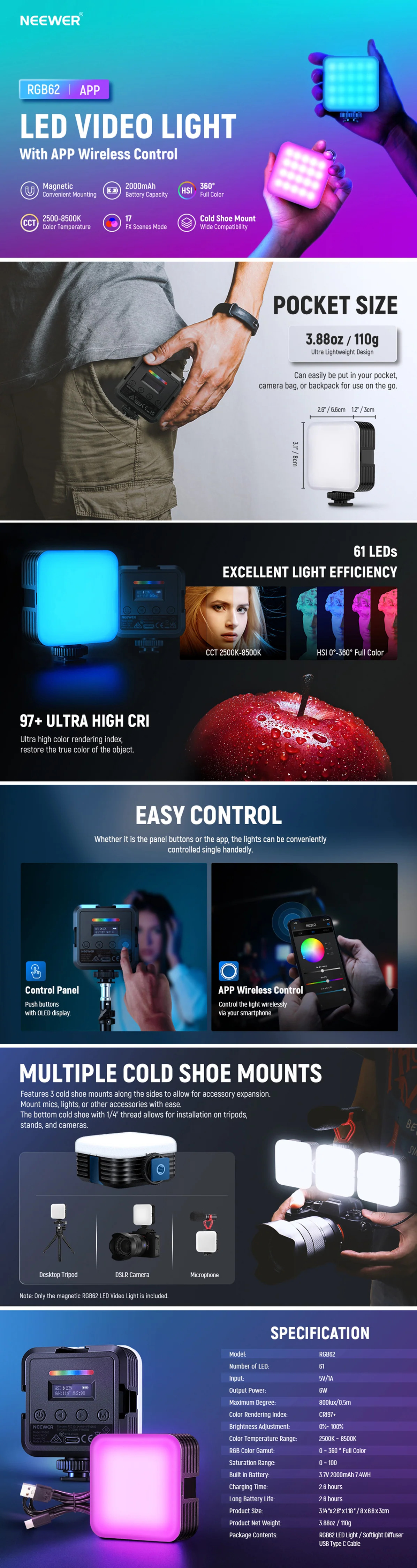 | Short Description | NEEWER RG62 Magnetic RGB Video Light will elevate your on-the-go lighting setup with this pocket sized photography light / video light, weighing only 3.88oz/110g. With 61 bright LEDs and a powerful 6W output, it delivers a maximum illumination of 800Lux / 0.5m. The high CRI97+ rating ensures accurate color reproduction. Included is a diffuser for a soft light effect, making it ideal for close up portraits, still life, selfies, and vlogs. |