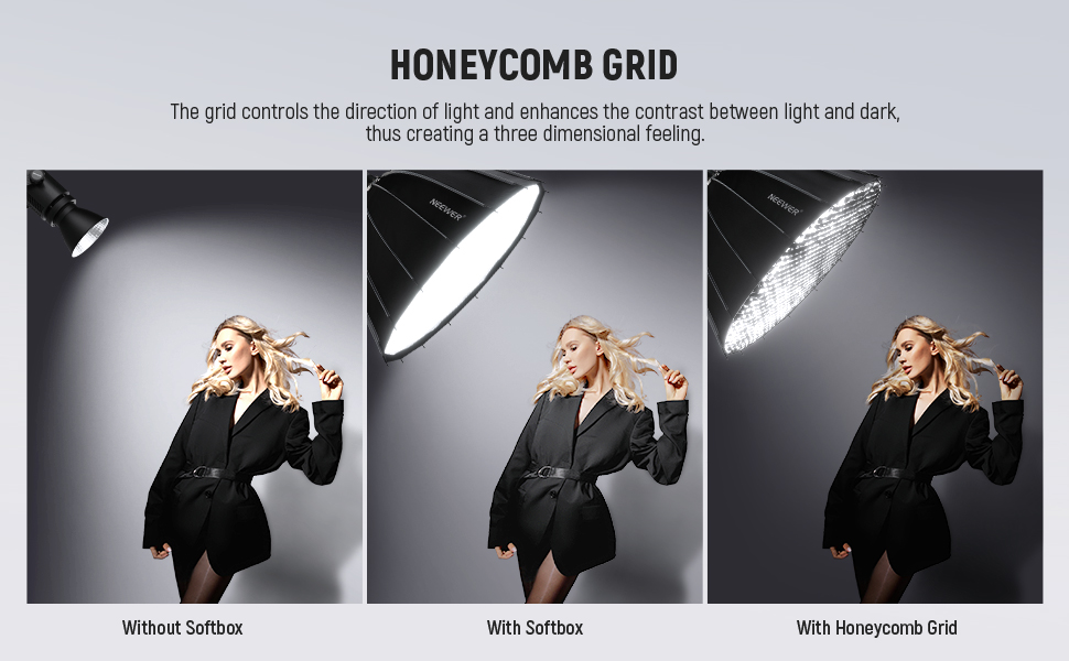 Customizable Honeycomb Grid & Diffusers- Using the honeycomb grid can make the light shape more confined and directional, allowing the beam angle to be concentrated at 45°, which gives photographers a dramatic and expressive light effect to define their model's facial structure. The 2 pieces of high-quality diffusers can be freely combined in use