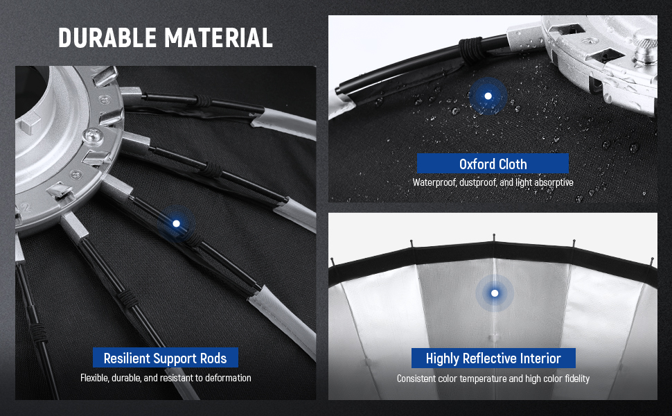 Quick Release & Quick Fold Structure- 16 highly resilient ribs give this softbox incomparable durability and an impeccable parabolic shape that can withstand tens of thousands of presses without deformation for years of use. The quick release design allows you to set the softbox up in less than 15 seconds without any tool. Foldable and merely 3.3lb (1.5kg) in weight, the softbox is easy to store and transport inside the included carrying bag
