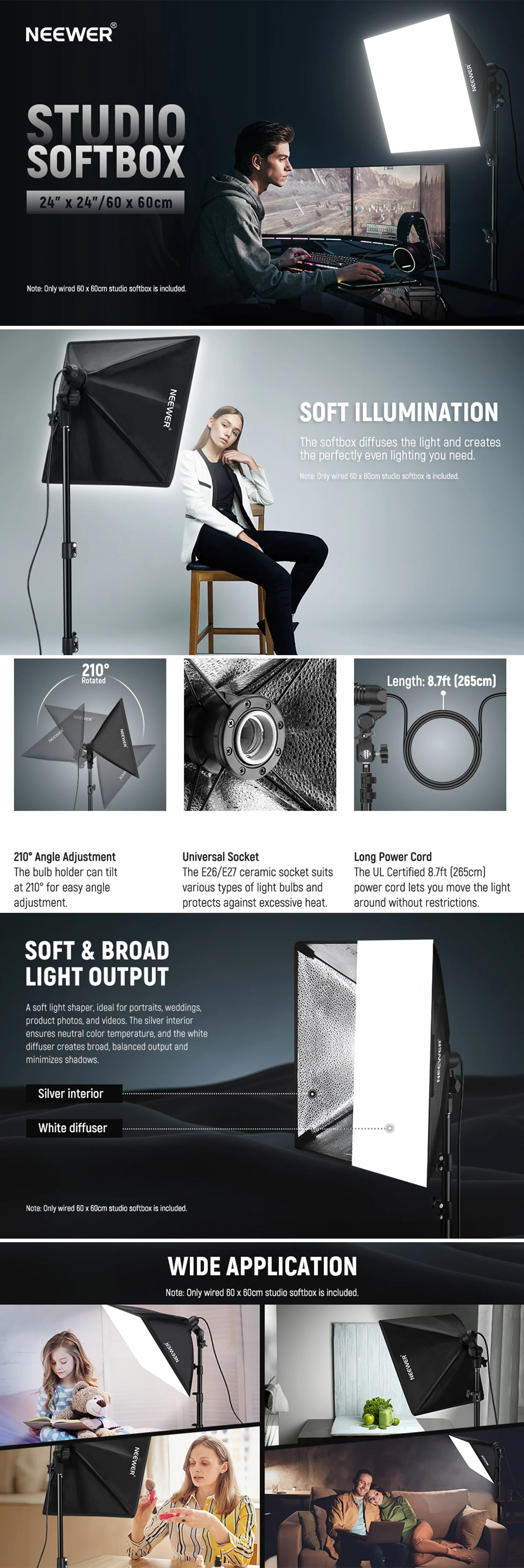 | Short Description | NEEWER SF6060 60x60cm Softbox is a soft light shaper, ideal for portraits, weddings, product photos, and videos. The silver interior ensures neutral color temperature, and the white diffuser creates broad, balanced output and minimizes shadows. Tough Nylon Construction- Thick and tough nylon fabric ensures higher durability. Hemmed edges prevent fraying for years of use |