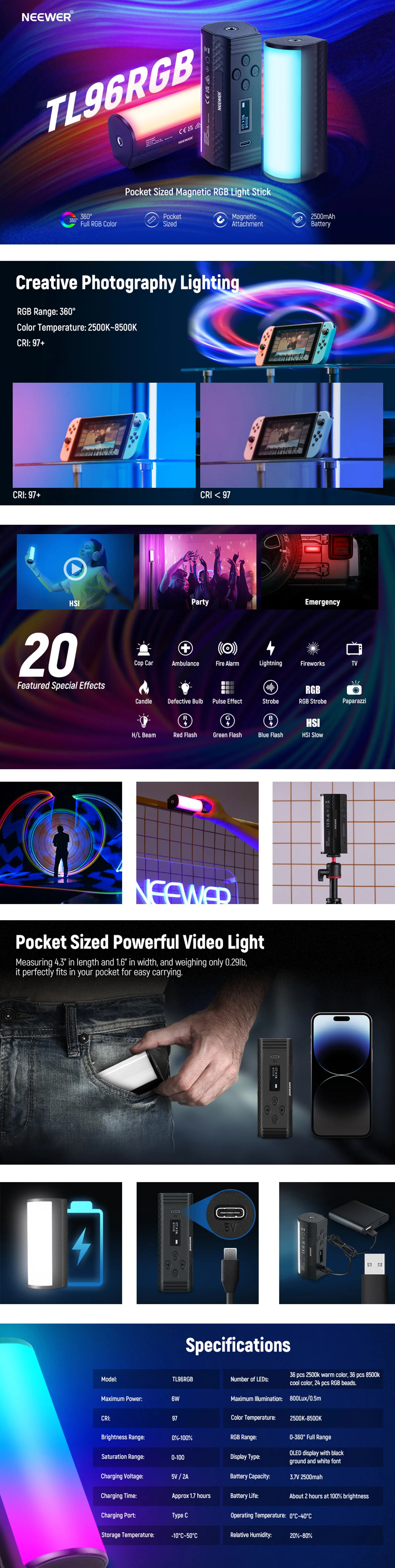 | Short Description | Pocket Sized Mini Handheld Light Wand- Measuring 10.8cm/4.3" in length and 4cm/1.6" in width, and weighing only 134g/4.7oz, this handheld mini light stick wand contains 96 pieces of high-performance LED beads with 6W maximum power, 97 CRI, 120° illumination angle, and 800 lux/0.5m illuminance. Clearly read light settings with the LCD display.For optimal lighting, keep it close to your subject (within a 6.6’/2m distance)Magnetic RGB Video Light- With strengthened magnetic force, the LED light stick can be attached to metal surfaces on its three sides. The RGB light includes 24 pcs of RGB beads, 36 pcs of warm color and 36 pcs of cool color beads. The free combination of different colored beads provides light with a 0~360° full RGB range, rich colors, and more lighting possibilities. Lightweight and portable, it is ideal for selfies, portraits, vlogs, still life shooting, part atmosphere lights, live streaming |