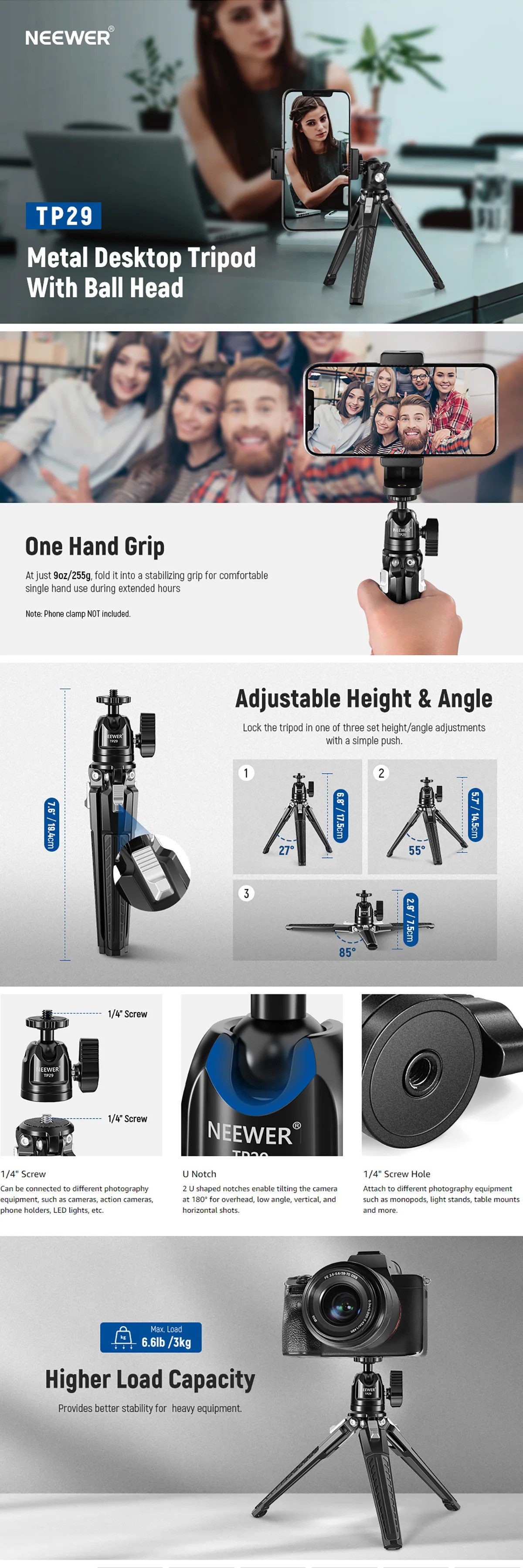 | Short Description | NEEWER TP29 Tabletop Mini Tripod easily fits in your pocket, and carry it with ease wherever you go, perfect for outdoor or filming on the go |
