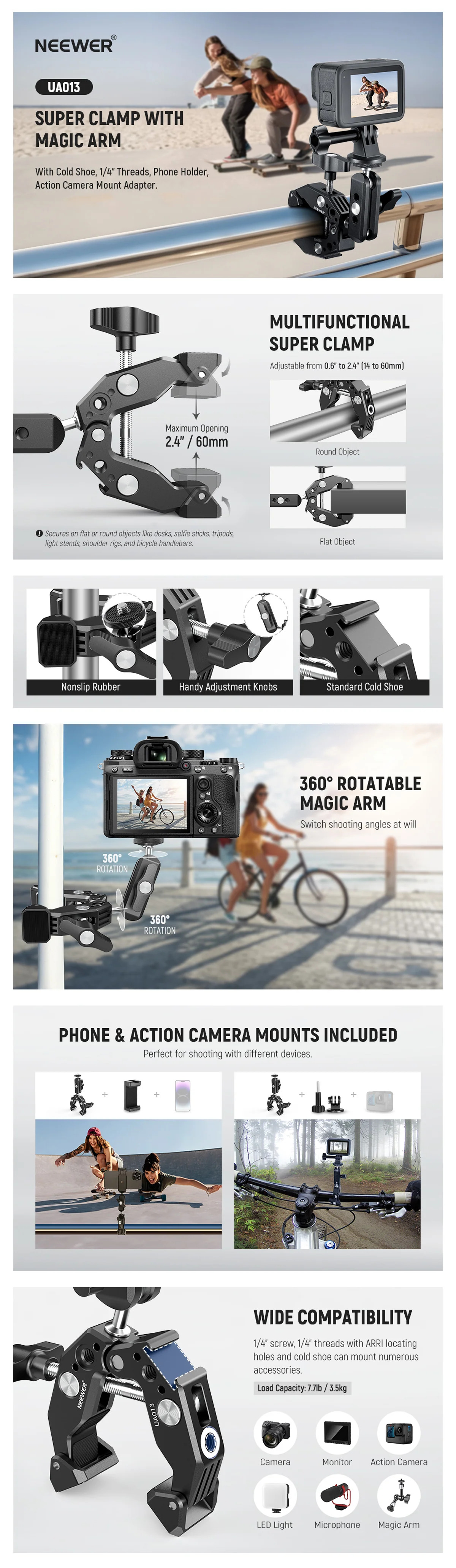 Wide Compatibility- Comes with a phone holder to support your smartphone and an action camera adapter to mount a wide range of action cameras, compatible with iPhone 14 Pro Max 14 Plus 13 Pro Max 13 Mini X Xs XR Samsung Galaxy S7 J7 Huawei P9 Plus OPPO R11s GoPro Hero 11 10 9 8 7 Black DJI Action 3, etc. A universal 1/4" screw is compatible with mirrorless cameras, vlog cameras, and monitors. The maximum payload is 7.7lb (3.5kg)