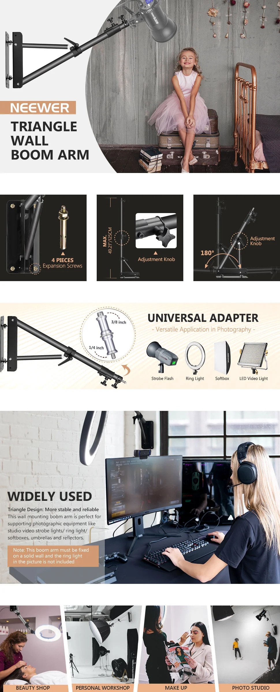 | Short Description | The Neewer wall-mounted boom arm is a space-saving holder for strobe, monolight, ring light, softbox, reflector, and microphone that need to be fixed on the wall of your room, studio, or workshop |
