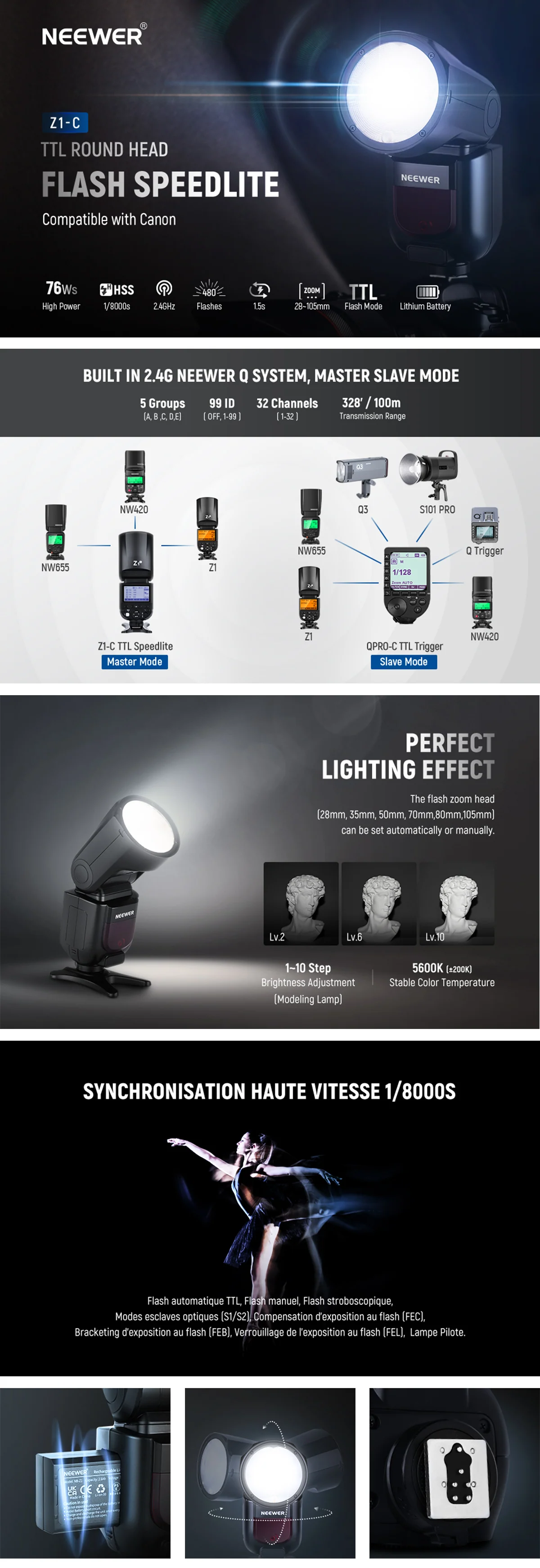 Perfect Lighting Effect- The Neewer Z1-C/N/S Canon/Nikon/Sony flash features a circular Fresnel head, which produces a more even light distribution from center to edge, with softer, more natural falloff at the edges, providing a natural and stunning lighting effect. The color temperature remains stable at 5600K (±200K). The flash zoom head (28–105mm) can be set automatically or manually. And 2W LED modeling lamp has 10 adjustable brightness levels from 01 to 10