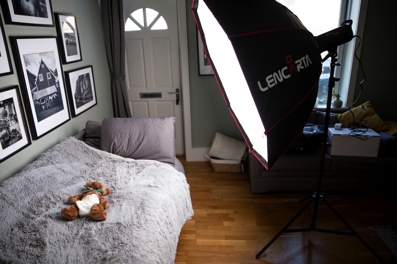 This was my initial set up for newborn however I decided to position the light to the side to make the light softer and also created a bit more shape with the lighting on Robbie’s face. Young babies tire quickly, so I used a teddy as a substitute for setting-up and practice.
