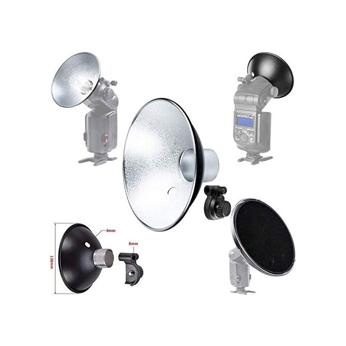 - QUICK AND EASY TO USE: The 14cm reflector is very easy to use. Simply place the reflector into the light unit ready to use. It is also very lightweight and portable making it ideal to use both on location and in the studio.