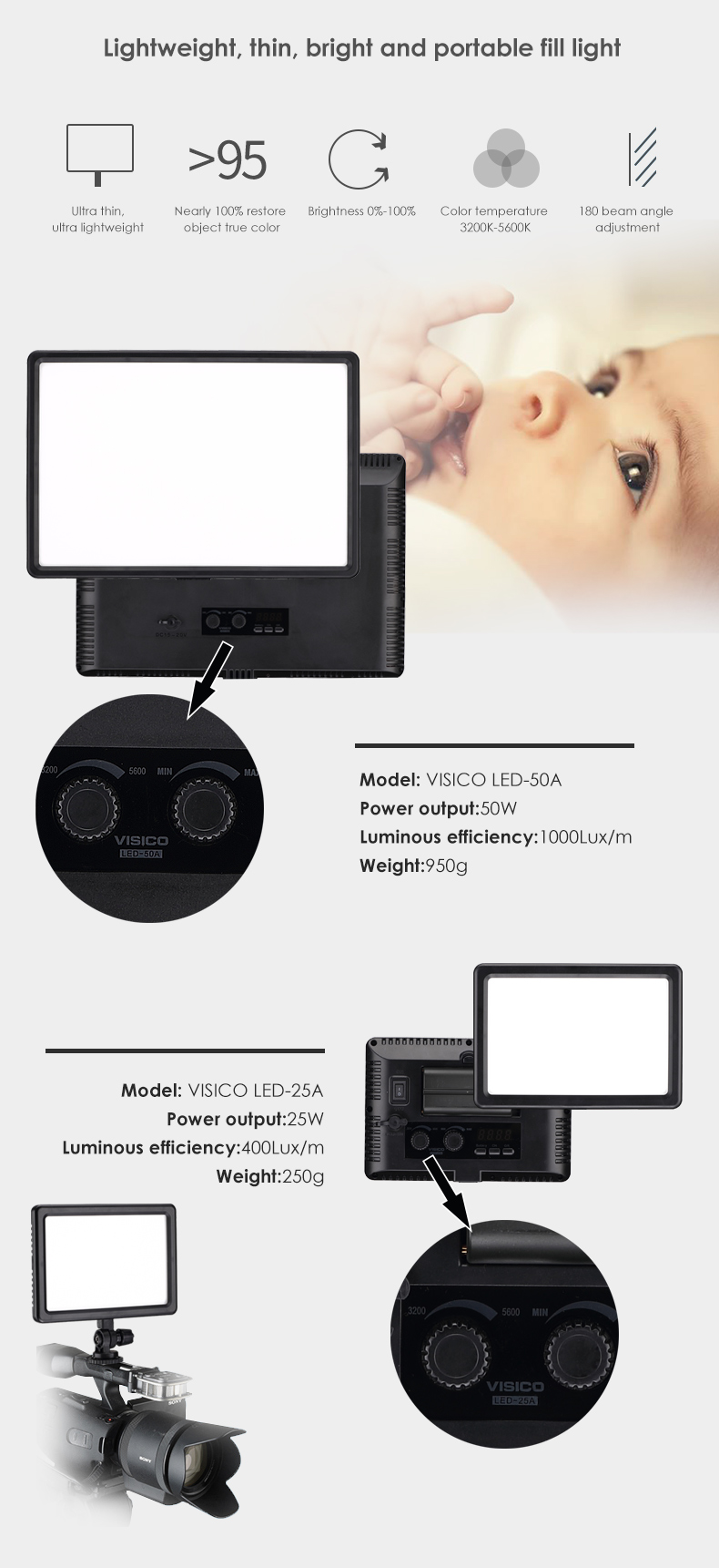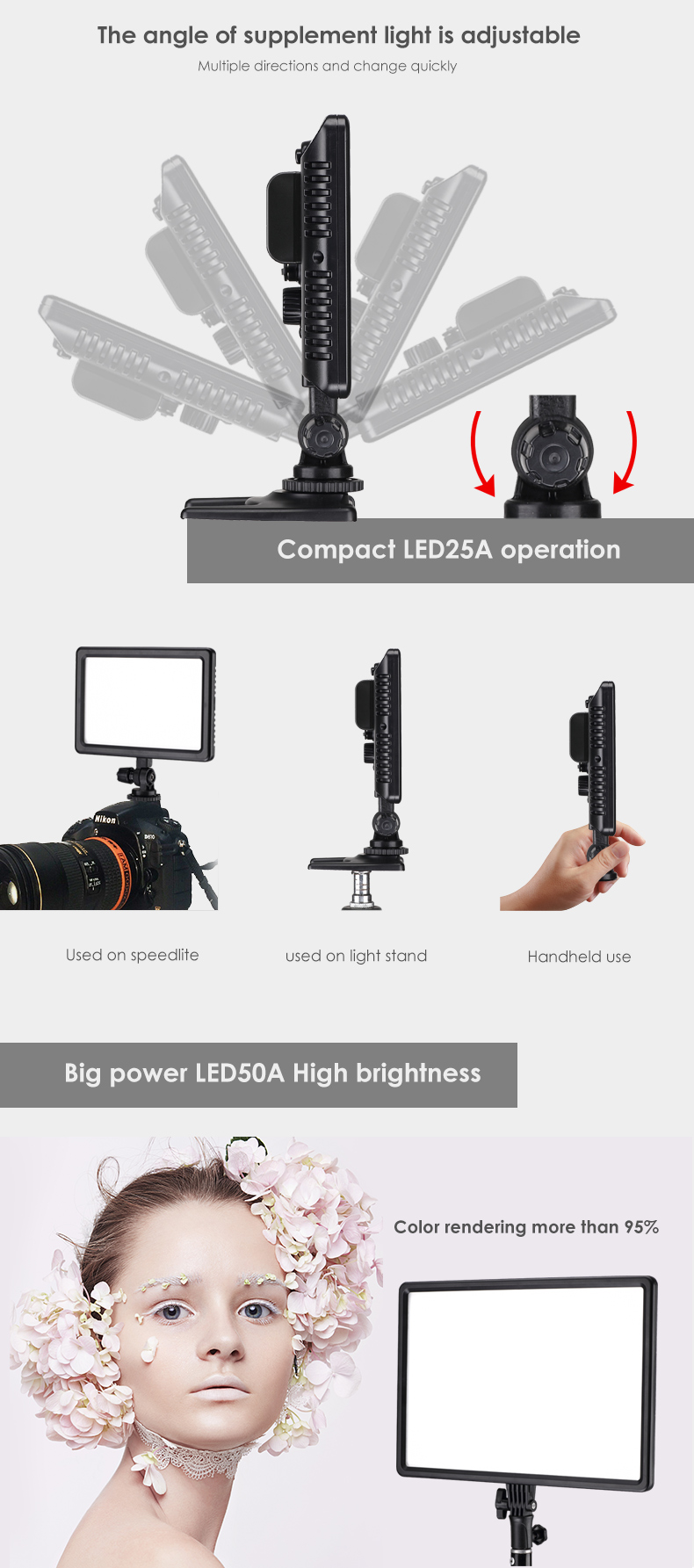 • Color rendering index CRI and TLCI are greater than 97%, which is close to natural light and perfectly restores the color of the subject.