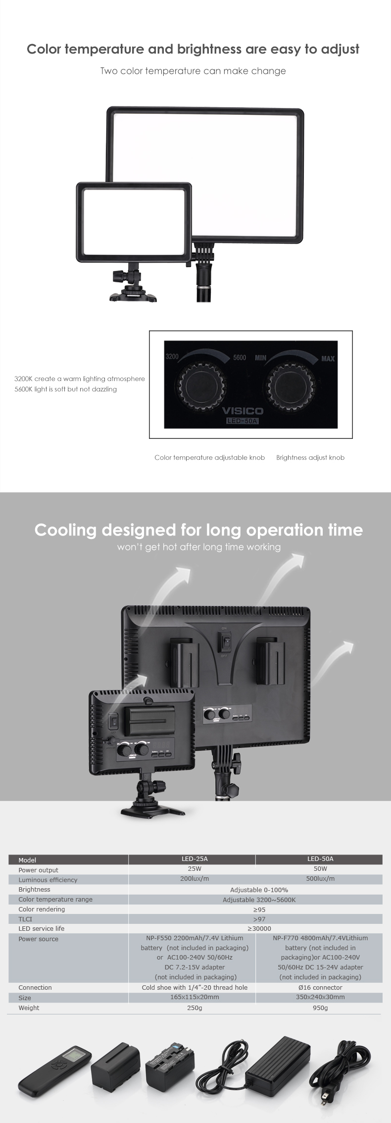 • Independent fine tune color temperature and power. Color temperature (3200 yellow to 5600K white) and brightness (0%- 100%) is steplessly adjusted.