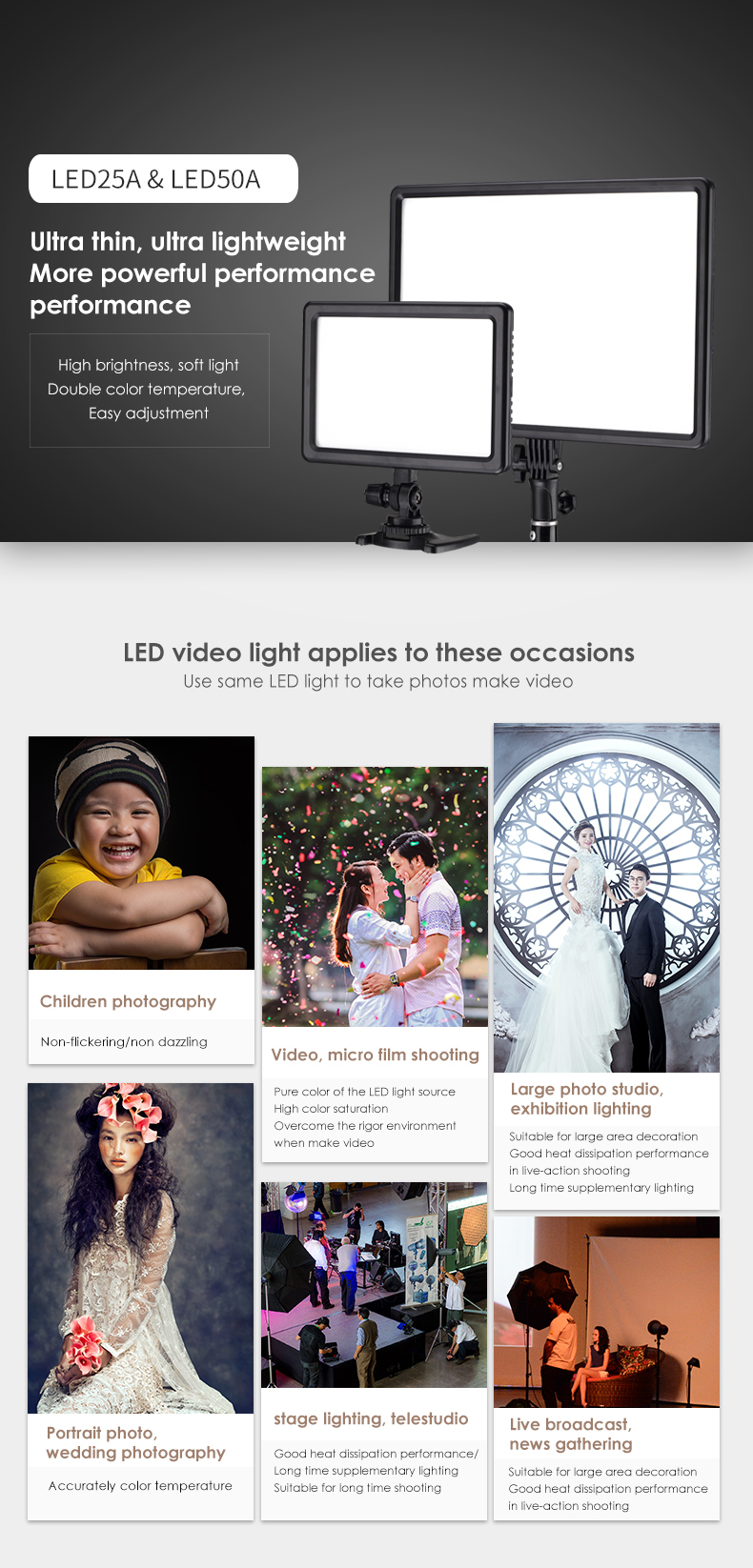 | Short Description | Super thin, light weight, compact, portable, and bright. Edgelight technology, provide a uniform, true soft light beam, and bright light source for high quality photograph images. Photo lighting products are essential tools for photographers and videographers, providing the necessary illumination to capture high-quality images and videos. |